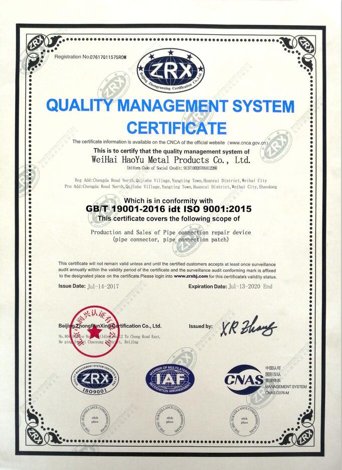 Our company is in Weihai, Shandong, a coastal and livable city with an exquisite environment.Founded in 2008, it is a professional company integrating R&D,production and sales for all types of pipe connection and repair products